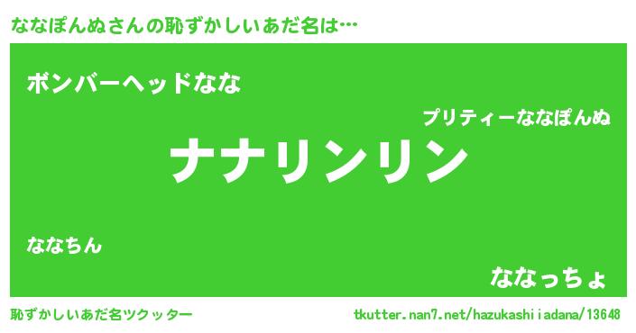 | 男性向けラノベタイトル風あだ名 | 『ダンジョンにななぽんぬを求めるのは間違っているだろうか』 |