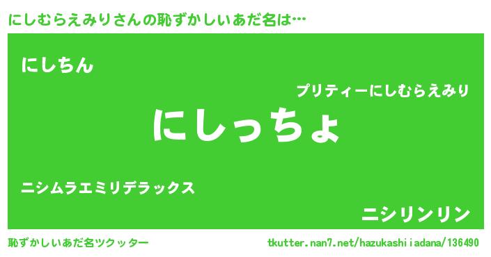 | 男性向けラノベタイトル風あだ名 | 『やはりにしむらえみりの青春ラブコメはまちがっている 』 |
