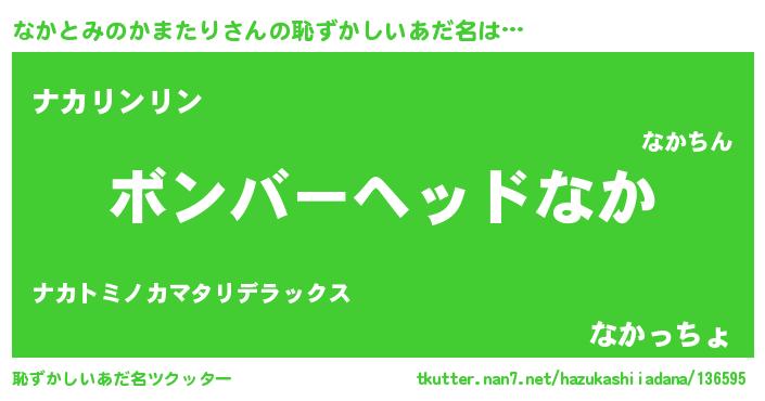 | 男性向けラノベタイトル風あだ名 | 『おまえをオタクにしてやるから、俺をなかとみのかまたりにしてくれ! 』 |
