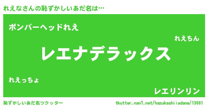 | 男性向けラノベタイトル風あだ名 | 『レエナスレイヤー』『魔弾の王とれえな』 |