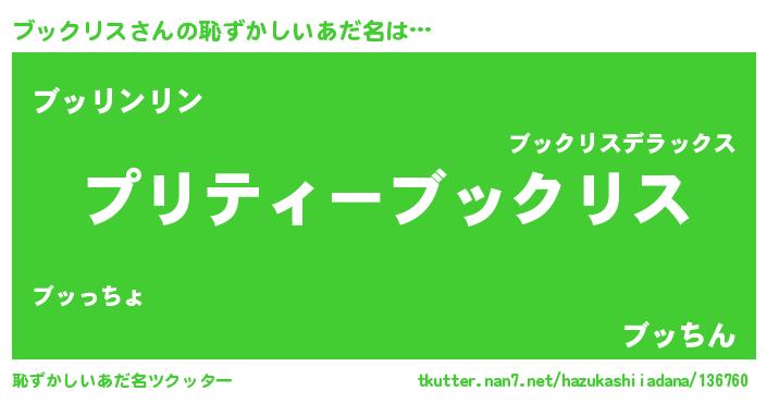 | 男性向けラノベタイトル風あだ名 | 『ブックリス~年齢イコール彼女いない歴の魔法使い~』 |