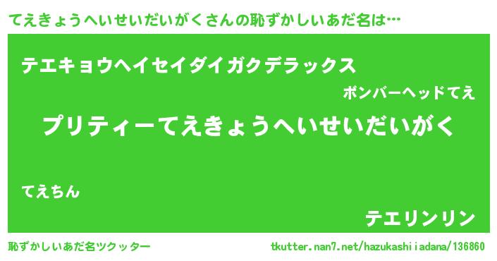 | 男性向けラノベタイトル風あだ名 | 『てえきょうへいせいだいがく~年齢イコール彼女いない歴の魔法使い~』 |