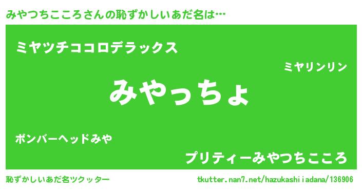 | 男性向けラノベタイトル風あだ名 | 『ミヤツチココロスレイヤー』 |