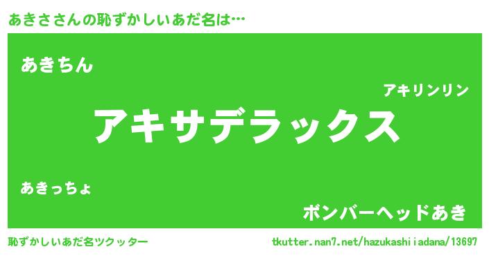 | ヘコむあだ名 | 『あきさ(笑)』『あきお』『酢こんぶ』 |