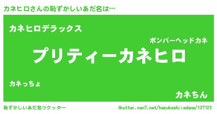 カネヒロさんの恥ずかしいあだ名は… 『プリティーカネヒロ』『カネヒロデラックス』『カネちん』 ツクッター #恥ずかしいあだ名ツクッター http://tkutter.nan7.net/hazukashiiadana/137123/