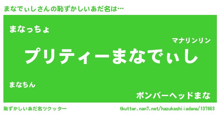 | 欧米人風あだ名 | 『まなでぃし・ステッグマイヤー』 |