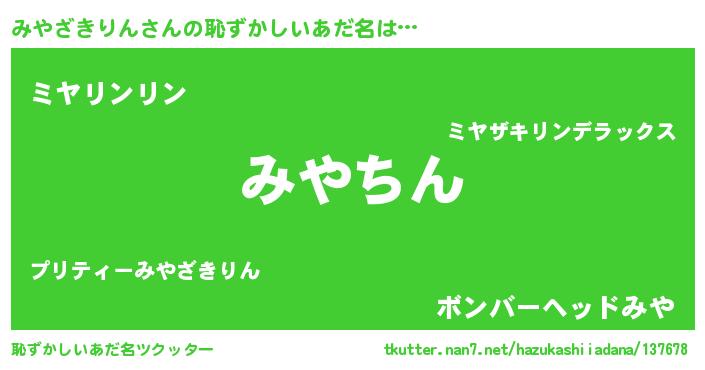 | 男性向けラノベタイトル風あだ名 | 『みやざきりん~年齢イコール彼女いない歴の魔法使い~』 |