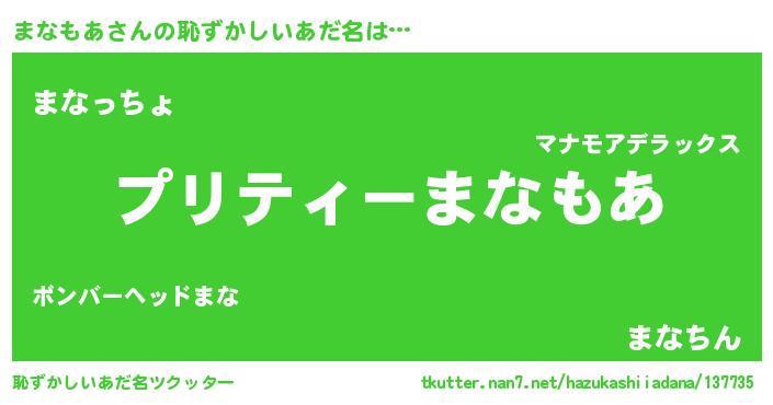 | 意味不明あだ名 | 『ペロリンまなもあ』『永久保存まなもあ』 |