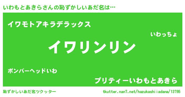 いわもとあきらさんの恥ずかしいあだ名は… 『イワリンリン』『イワモトアキラデラックス』『プリティーいわもとあきら』 ツクッター #恥ずかしいあだ名ツクッター http://tkutter.nan7.net/hazukashiiadana/13795/