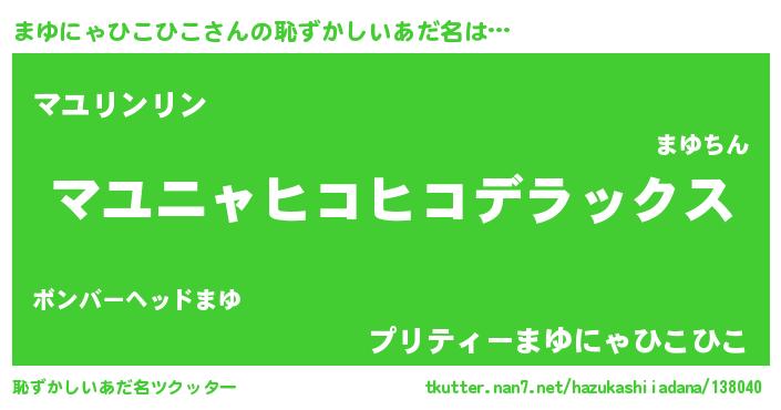 | 男性向けラノベタイトル風あだ名 | 『Re:まゆにゃひこひこから始める異世界生活』 |