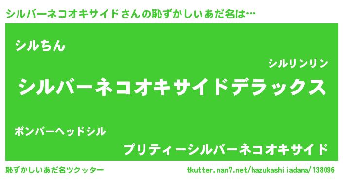 | 男性向けラノベタイトル風あだ名 | 『Re:シルバーネコオキサイドから始める異世界生活』 |