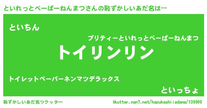 | 男性向けラノベタイトル風あだ名 | 『この素晴らしい世界にといれっとぺーぱーねんまつを!』 |