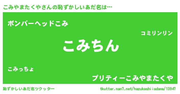 | ヘコむあだ名 | 『こみやまたくや(笑)』『こみっふぃ~』 |