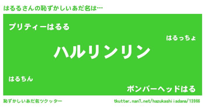 | 男性向けラノベタイトル風あだ名 | 『はるるの嫁は女の子じゃないと思った?』 |