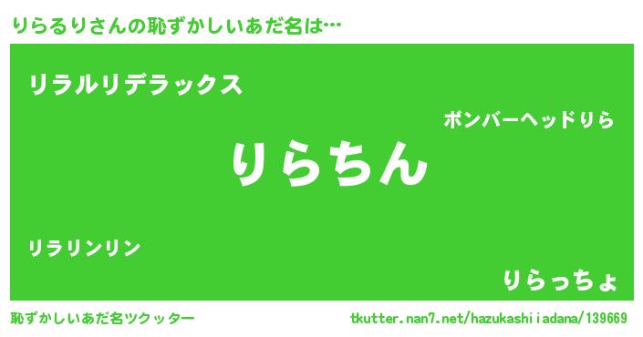 | 意味不明あだ名 | 『永久保存りらるり』『自称りらるり』 |