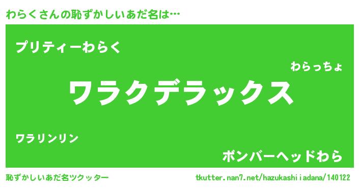 | 男性向けラノベタイトル風あだ名 | 『はたらくわらくさま!』『わらくの憂鬱』 |