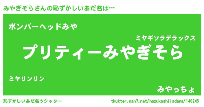| ヘコむあだ名 | 『みやふぇ~』『レバニラ』『みやを』 |