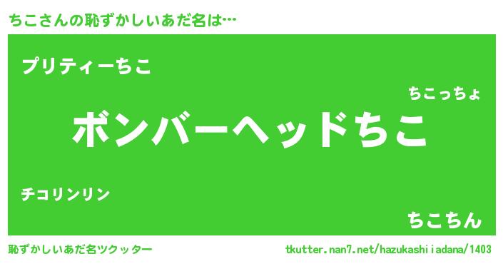 | 女子向けラノベタイトル風あだ名 | 『死神ちこの再婚』『ちこ姫と円卓の騎士』 |