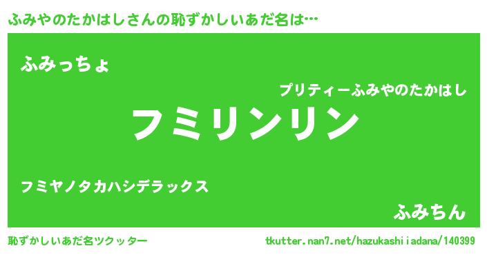 | 男性向けラノベタイトル風あだ名 | 『ふみやのたかはしの嫁は女の子じゃないと思った?』 |