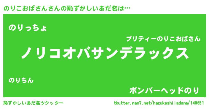 | 男性向けラノベタイトル風あだ名 | 『Re:のりこおばさんから始める異世界生活』 |