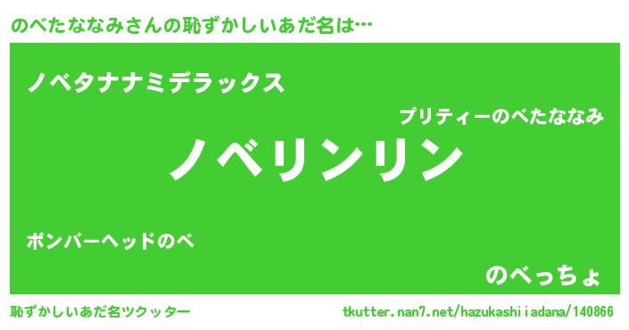 | 男性向けラノベタイトル風あだ名 | 『のべたななみの嫁は女の子じゃないと思った?』 |