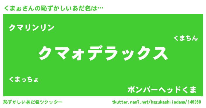 | 意味不明あだ名 | 『自称くまぉ』『とにかく怪しいくまぉ』 |