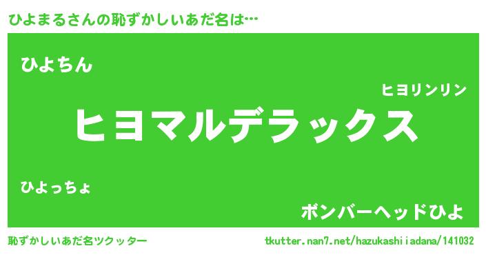 | 男性向けラノベタイトル風あだ名 | 『Re:ひよまるから始める異世界生活』 |