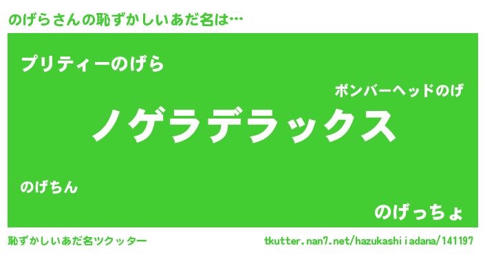 | 男性向けラノベタイトル風あだ名 | 『のげらに滅ぼされるだけの簡単なお仕事です』 |