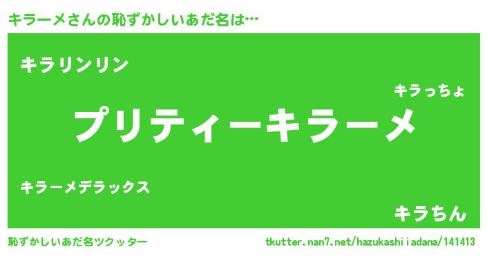 | 意味不明あだ名 | 『ペロリンキラーメ』『永久保存キラーメ』 |
