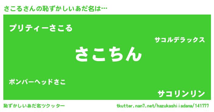 さこるさんの恥ずかしいあだ名は… 『さこちん』『プリティーさこる』『サコリンリン』 ツクッター #恥ずかしいあだ名ツクッター http://tkutter.nan7.net/hazukashiiadana/141777/