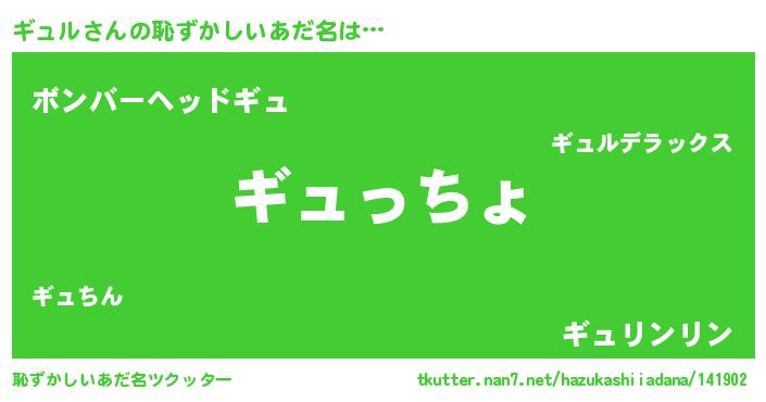 | 女子向けラノベタイトル風あだ名 | 『ギュルの雑貨屋さん』『ギュル恋絵巻』 |