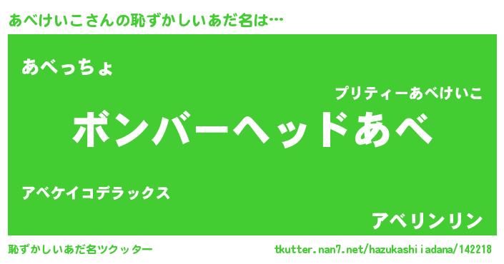 | ヒーロー風カッコイイあだ名 | 『正義の使者あべけいこ』『暗黒騎士アベ』 |