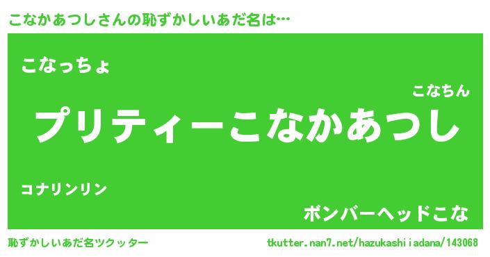 | 男性向けラノベタイトル風あだ名 | 『魔弾の王とこなかあつし』 |