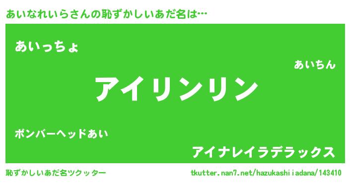| 男性向けラノベタイトル風あだ名 | 『あいなれいらの嫁は女の子じゃないと思った?』 |