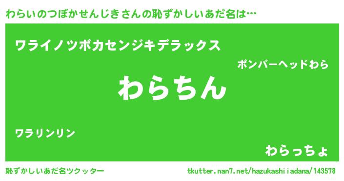 わらいのつぼかせんじきさんの恥ずかしいあだ名は… 『わらちん』『ワライノツボカセンジキデラックス』『わらっちょ』 ツクッター #恥ずかしいあだ名ツクッター http://tkutter.nan7.net/hazukashiiadana/143578/