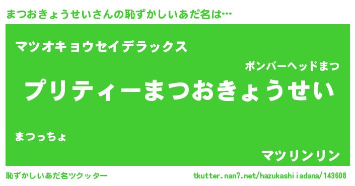 | 男性向けラノベタイトル風あだ名 | 『うちのまつおきょうせいが世界を掌握している!』 |