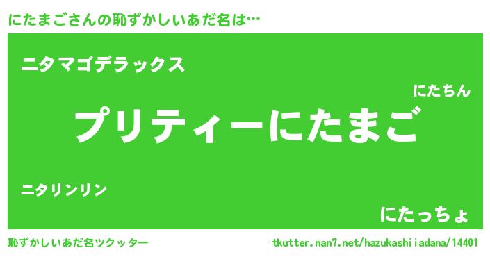 | 男性向けラノベタイトル風あだ名 | 『にたまごの憂鬱』『魔弾の王とにたまご』 |