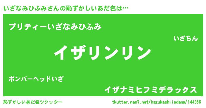 | 男性向けラノベタイトル風あだ名 | 『いざなみひふみの嫁は女の子じゃないと思った?』 |