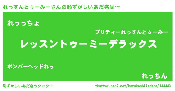 | 意味不明あだ名 | 『自称れっすんとぅーみー』 |