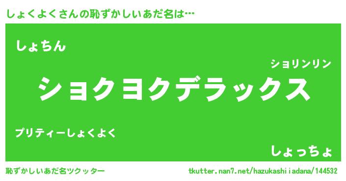 しょくよくさんの恥ずかしいあだ名は… 『ショクヨクデラックス』『しょちん』『しょっちょ』 ツクッター #恥ずかしいあだ名ツクッター http://tkutter.nan7.net/hazukashiiadana/144532/