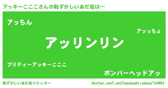 | 男性向けラノベタイトル風あだ名 | 『アッキーこここの嫁は女の子じゃないと思った?』 |