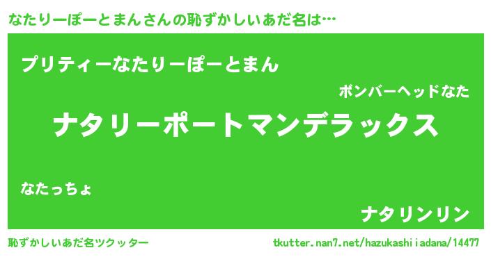 | 男性向けラノベタイトル風あだ名 | 『Re:なたりーぽーとまんから始める異世界生活』 |
