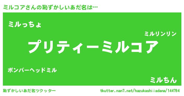 | 意味不明あだ名 | 『ペロリンミルコア』『永久保存ミルコア』 |