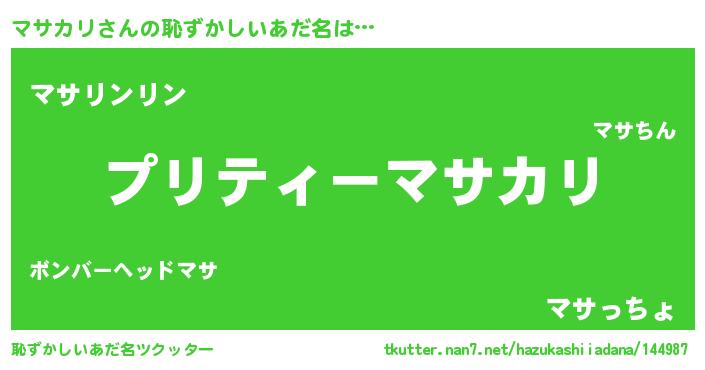 | 男性向けラノベタイトル風あだ名 | 『マサカリ~年齢イコール彼女いない歴の魔法使い~』 |