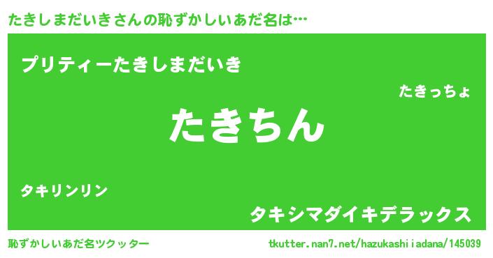 | ヘコむあだ名 | 『たきしまだいき(爆)』『たきにゅー』 |