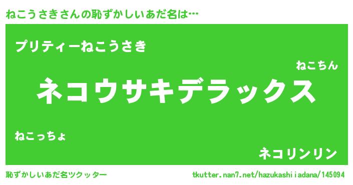 | 男性向けラノベタイトル風あだ名 | 『この素晴らしい世界にねこうさきを!』 |