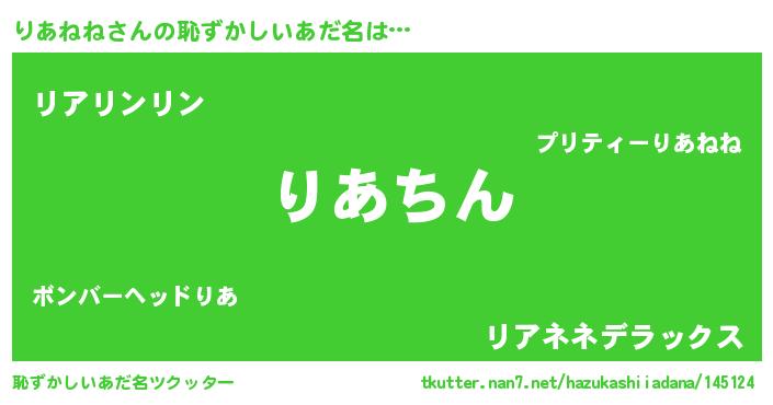 | ヘコむあだ名 | 『りあねね(苦笑)』『りあ太郎』 |