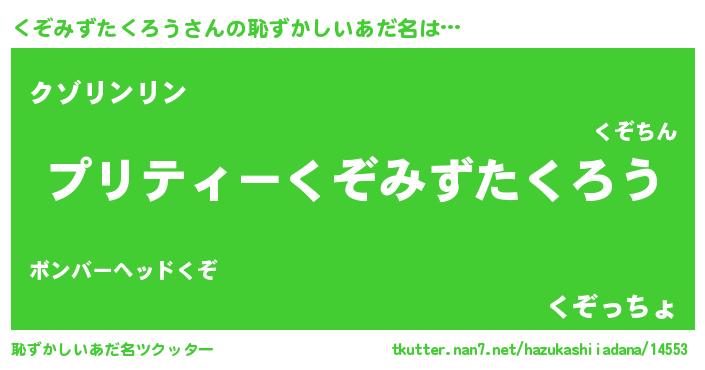 | 男性向けラノベタイトル風あだ名 | 『くぞみずたくろうの憂鬱』 |