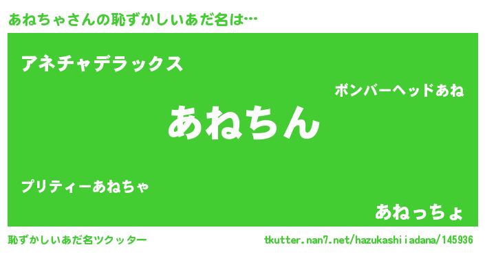 | 男性向けラノベタイトル風あだ名 | 『あねちゃという概念が存在しない退屈な世界 』 |