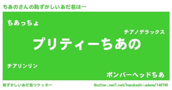 | 男性向けラノベタイトル風あだ名 | 『ちあのの憂鬱』『魔法科高校のちあの』 |